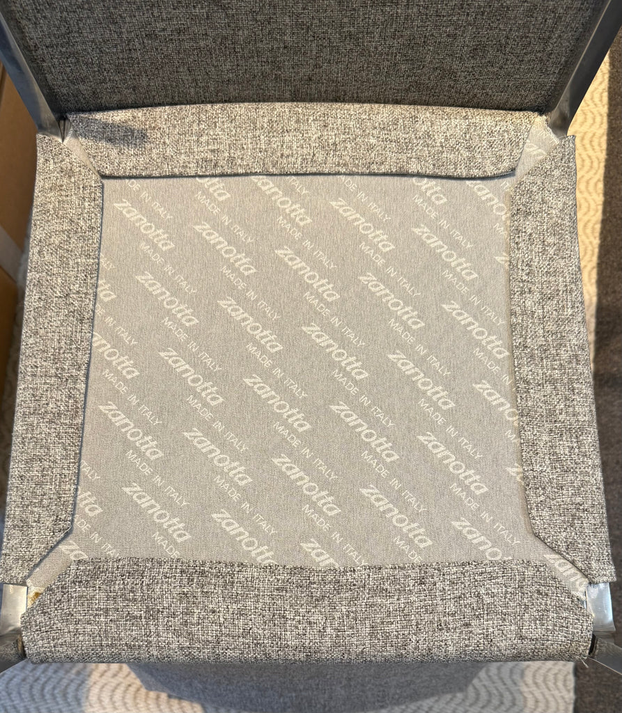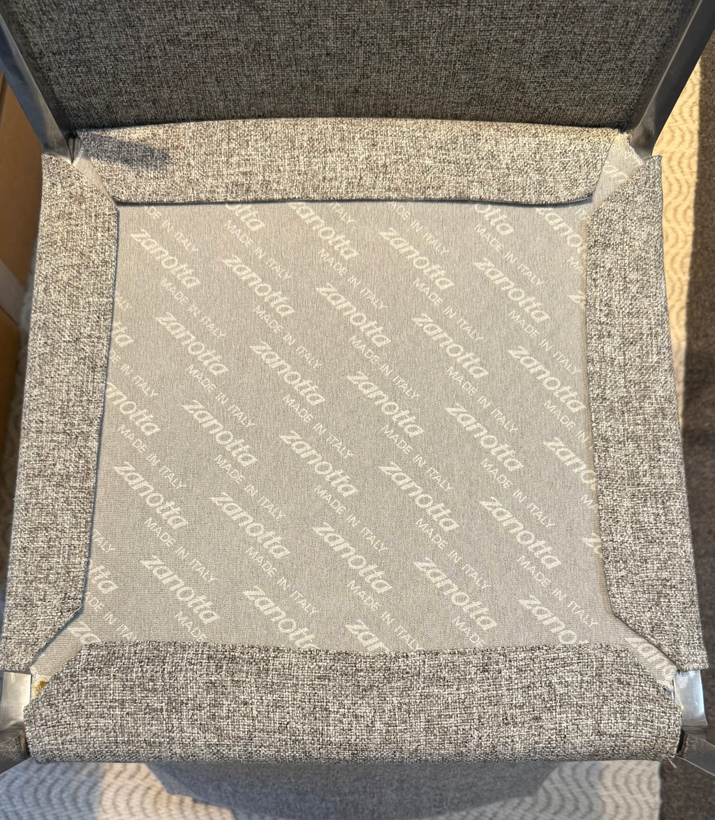 Set Of Six Zanotta "Lia" Chair Designed By Roberto Barbieri. The Lia chair is a beautiful example of minimalist seating. With its thin polished aluminium frame and narrow-profile, it has a gently curved seat and back, ensuring amazing comfort.