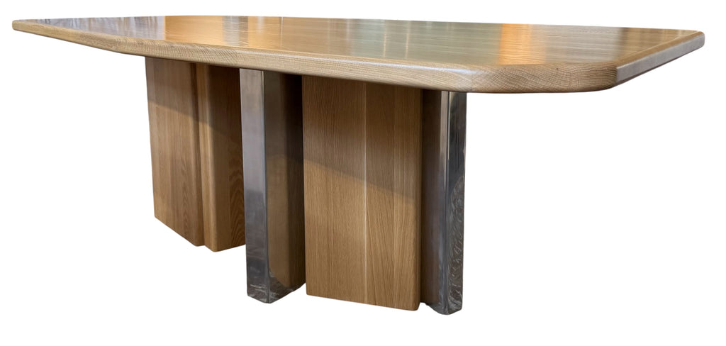 Assymetrical Custom Dining Table made of White Oak. Oak and Polished Aluminum Double Pedestal Base.